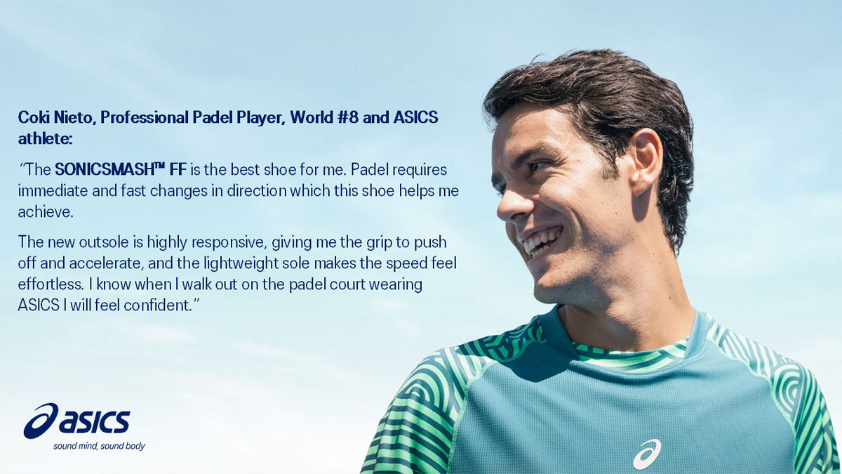 „Der SONICSMASH™ FF ist für mich der beste Schuh. Padel erfordert schnelle, unmittelbare Richtungswechsel, die mir dieser Schuh ermöglicht. Die neue Außensohle reagiert sehr präzise, gibt mir den nötigen Halt, um mich abzustoßen und zu beschleunigen, und dank der leichten Sohle fühlt sich die Geschwindigkeit mühelos an. Wenn ich mit ASICS auf den Padel-Court gehe, weiß ich, dass ich mich selbstbewusst fühle.“